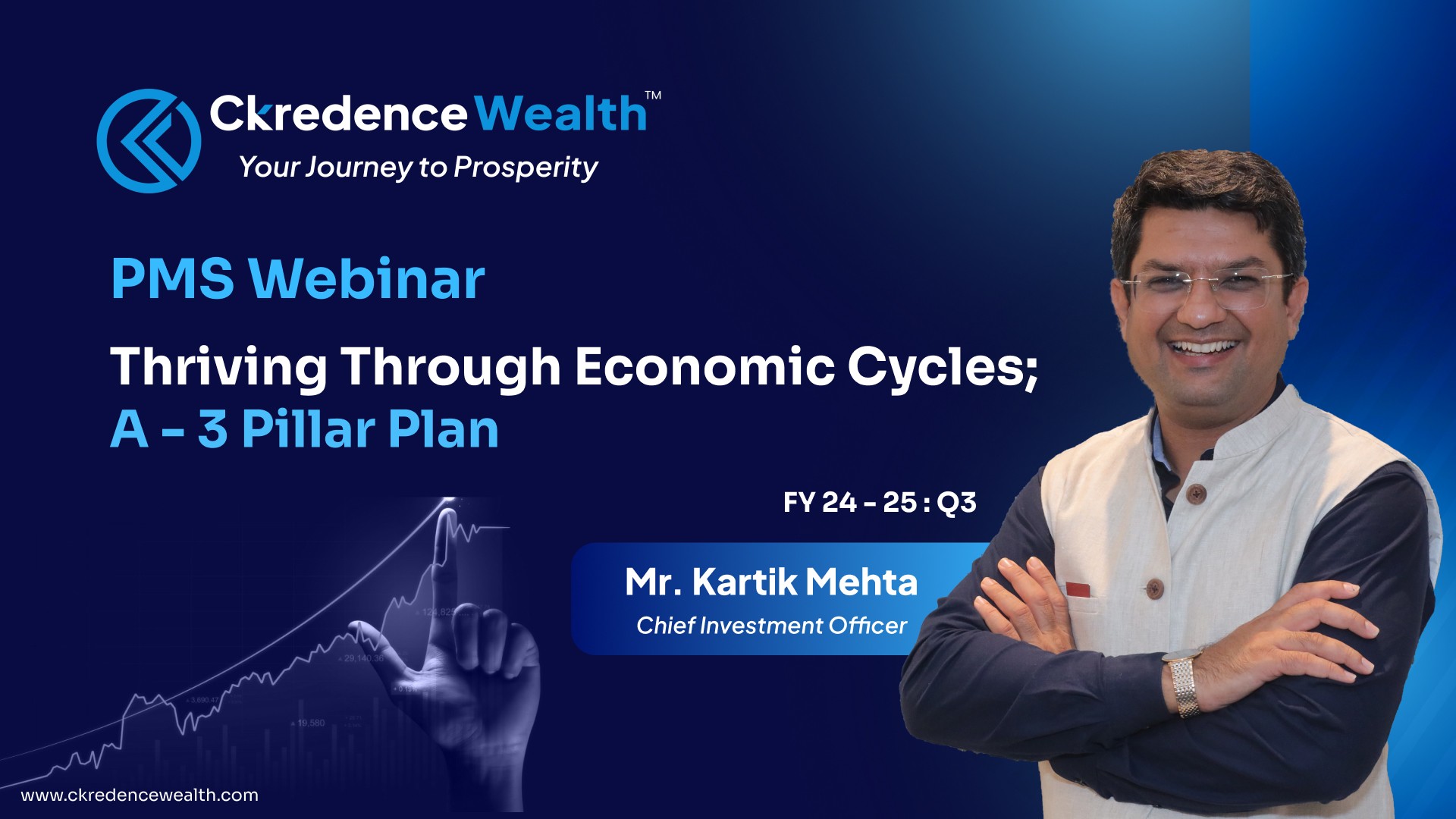 This Webinar hosted by Ckredence Wealth on the topic of "Thriving Through Economic Cycles: A 3-Pillar Plan". Any Economy Formulates its Base on 3 pillars Investment, Consumption and Exports with this the fund manager introduces a new fund launched by Ckredence Wealth, the Ice Growth Fund. The webinar features Mr. Kartik Mehta, a fund manager with 19 years of experience in the equity markets, as the guest speaker. Mr. Mehta also discusses his investment strategies and insights, including the latest market updates and effective strategies to navigate the current economic landscape. The webinar concludes with a Q&A session.